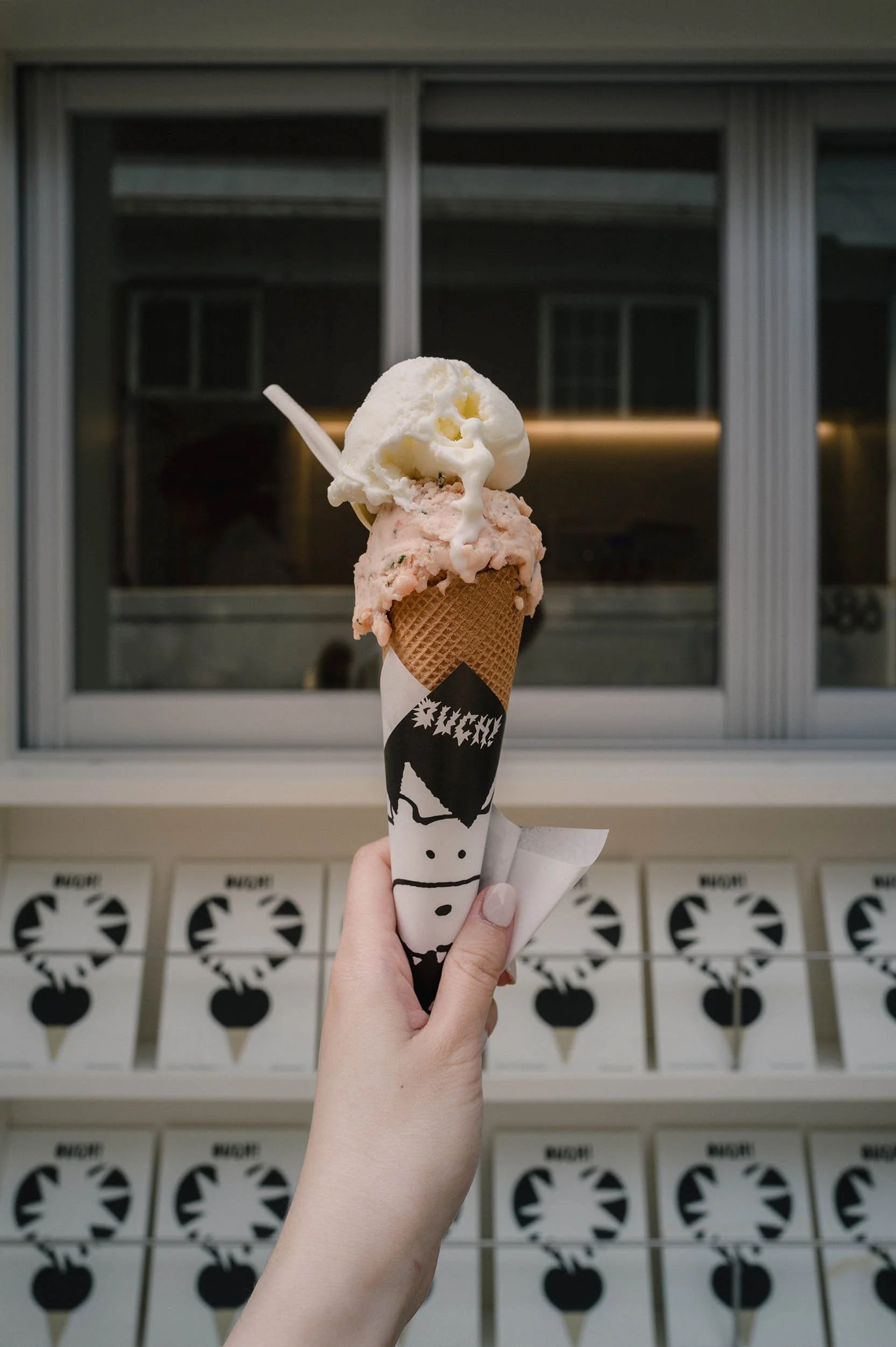 An ice cream shop by the pastry academy HONEYBEE SEOUL offers both soft serve and traditional ice cream scoops, featuring unique savory flavors like salt milk and tomato bang-ah in the chic neighborhood of Hannam-dong.